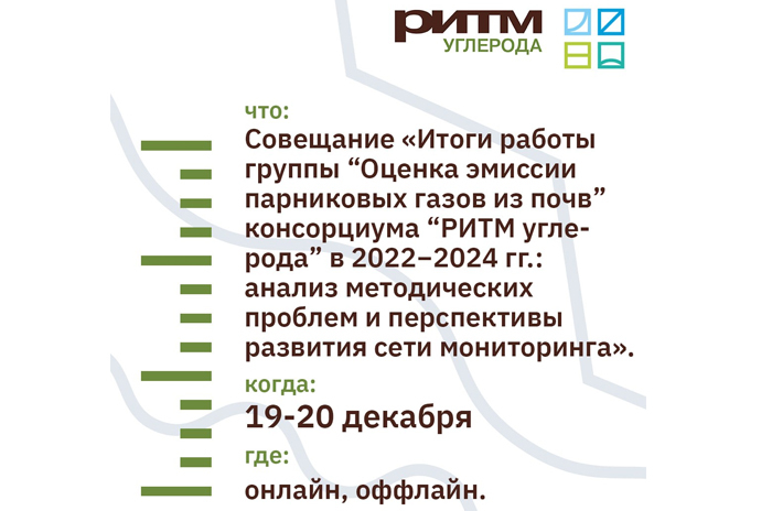 19−20 декабря в гибридном формате пройдет совещание "Итоги работы группы “Оценка эмиссии парниковых газов из почв” консорциума “РИТМ углерода” в 2022−2024 гг.: анализ методических проблем и перспективы развития сети мониторинга".